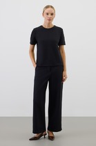 Широкие укороченные брюки из мягкого эластичного футера создают непринужденный образ. Высокий пояс с имитацией застежки и защипы придают брюкам расслабленный стиль. Подарите себе комфорт и свободу с нашим качеством.