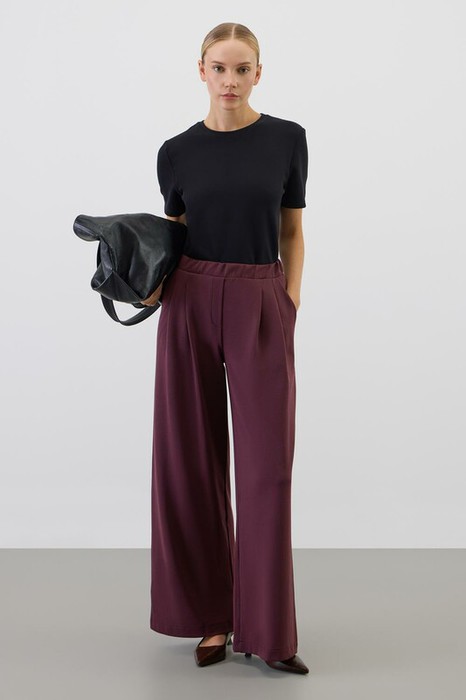 Брюки прямого кроя с защипами изготовлены из высококачественного трикотажного полотна DOUBLE FACE с добавлением спандекса. Ткань прошла каучуковую обработку, что придает ей легкость и шелковистую текстуру. Прямой крой акцентирует силуэт, формируя элегантный классический образ. Боковые карманы добавляют изделию практичности.