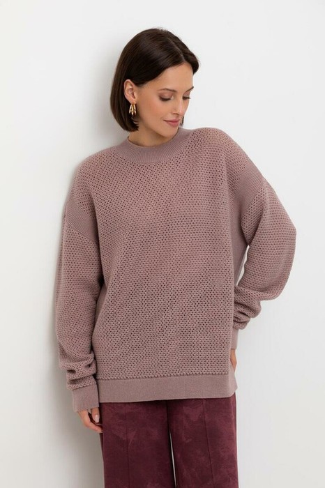 Джемпер с удлиненной спинкой и разрезами по бокам связан ажурной вязкой "волна". Средняя плотность вязания и пластичная фактура сохраняют форму изделия.