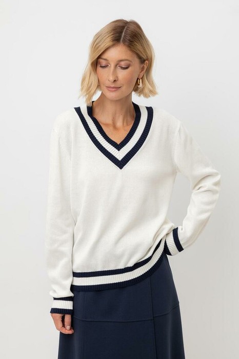 Гладкий хлопковый джемпер с V-вырезом является основой любого гардероба. Его дополняет не менее классическая отделка контрастными деталями, а спущенная линия плеч завершает его комфортной посадкой.