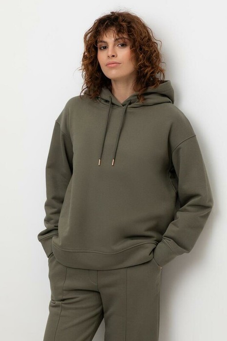 Толстовка с капюшоном и боковыми карманами из петельчатого футера трехнитки. В составе 80% натурального хлопка и 20% полиэстера, при этом полиэстер ввязан внутрь по особой технологии и не соприкасается с кожей. Спущенные рукава, манжеты из основного полотна. Свободный силуэт.