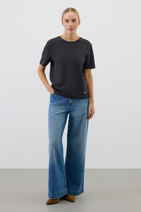 Базовая футболка из премиального трикотажа DOUBLE FACE.  Трикотаж прошел специальную каучуковую обработку, что придает ему легкость и шелковистость текстуры. Имеет классический круглый вырез и удобный прямой крой.