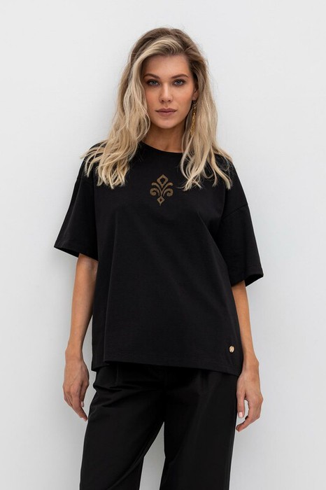 Удлиненная футболка из 100% натурального хлопка. Свободные рукава со спущенной линией плеча создают объём и свободный силуэт. Принт изготовлен из стойких текстильных красителей.