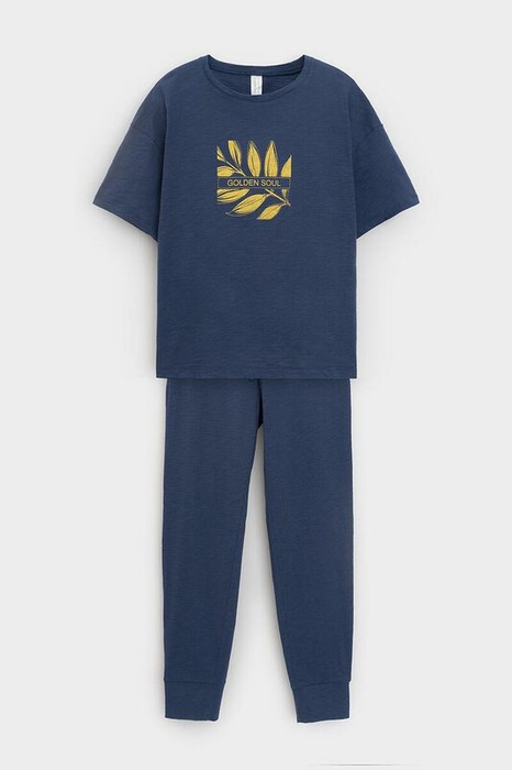 Легкий комплект для комфортного сна и отдыха из меланжевого трикотажа. Футболка с принтом и спущенной линией плеча комфортно садится по фигуре.  Брюки с эластичными манжетами с боковыми карманами. Круглый шнур позволяет регулировать посадку. Гладкий материал приятен к телу и позволяет коже дышать.