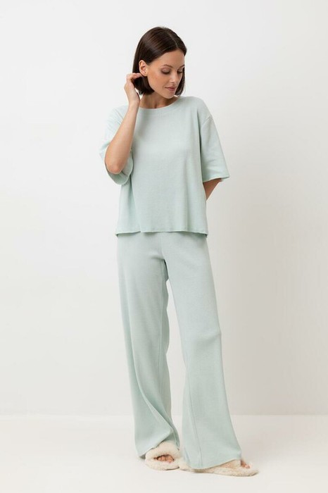 Комплект из объемного трикотажа с добавлением эластичных волокон. Свободный силуэт, мягкий пояс и отсутствие боковых швов на брюках обеспечат комфорт во время сна и отдыха.