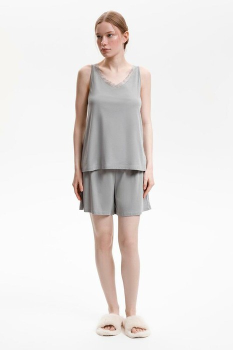 Легкий комплект приглушенного зеленого оттенка выполнен из хлопка с нежнейшим модалом. Свободный крой топа декорированный эластичным кружевом и мягкий пояс шорт обеспечивают легкость и свободу движений.