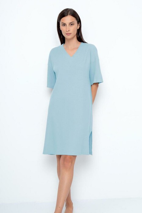 Платье для комфортного отдыха из вафельного полотна с V-образным вырезом из 100% натурального хлопка. Короткий рукав, спущенное плечо, по бокам разрезы. Свободный силуэт не сковывает движения.