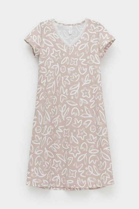 Уютная удлиненная сорочка с короткими рукавами из 100% натурального хлопка. Горловина украшена эластичным кружевом. Выполнена из набивного трикотажа супрем с нежным рисунком.