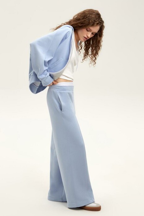 Объемная толстовка из двухцветного трикотажного футера. Внутренняя сторона изделия представлена в натуральном цвете хлопка, внешняя в нежно-голубом. За счет использования крашенной пряжи данный вид полотна прошел минимальную обработку, что придало изделию мягкость и шелковистость.