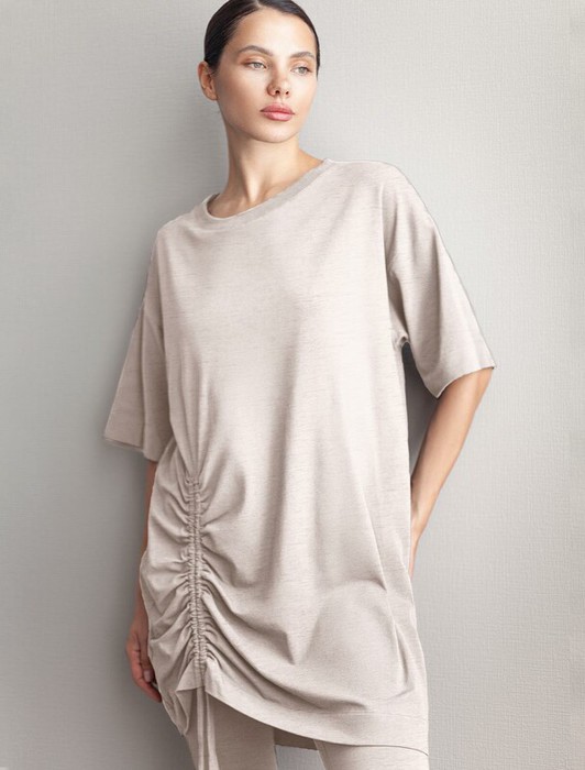 Платье-туника свободного кроя выполнено из премиального хлопка с эластаном. Трендовой асимметричности изделию добавляет боковая вертикальная кулиска со шнуром из основного полотна. Хлопковый дышащий материал позволяет коже поддерживать оптимальный микроклимат. Сочетается в костюме с леггинсами D44.131