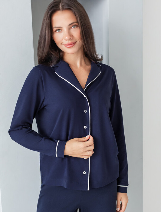 Блузка с английским воротом и длинным рукавом выполнена из эластичного хлопка. Модель дополнена контрастным кантом. Самые мягкие волокна премиального хлопка гарантируют непревзойденный комфорт в течении всего дня. Эластан в составе изделия, поддерживает форму и препятствует сминаемости. Сочетается в костюме с шортами D48.006 и брюками D44.120