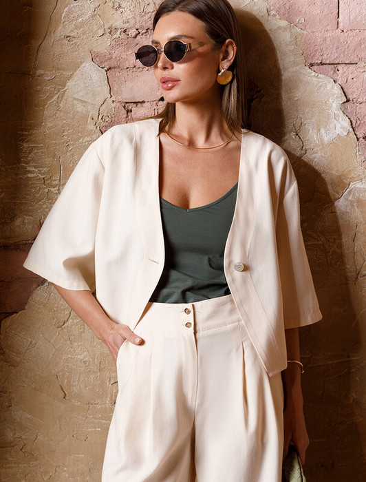 Блузка свободного кроя в стиле кимоно выполнена из плотного лиоцелла. Модель со спущенным плечом и застежкой на одну пуговицу. Ткань изделия отлично держит форму, плавно драпируется и не просвечивает. В теплое время года приятно охлаждает кожу. Добавление синтетических волокон в составе изделия, предотвращает сминаемостьи поддерживает формоустойчивость. Блузка сочетается в костюме с брюками D24.261, D24.265, D24.267, шортами D28.057 и  юбкой D24.261, а также очень эффектно с белыми шортами и джинсами.