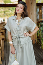 Блузка выполнена из полупрозрачного лиоцелла с эффектом шелка. Праздничная и переливающаяся фактура ткани изыскано играет в вечернем освещении. Легкая и почти невесомая модель, приятно ощущается на теле. Застежка на пуговицы из натурального перламутра, подчеркивает роскошь.