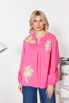 Свободный крой блузки и спущенная линия плеча дарят ощущение легкости и непринужденности, делая образ одновременно женственным и современным. Широкие рукава средней длины гармонично дополняют образ и идеально подходят для полных рук, обеспечивая комфорт, свободу движений и уверенность. Аккуратная застежка на маленькую пуговицу добавляет утонченности, а круглый вырез красиво обрамляет шею, создавая аккуратную линию декольте.
