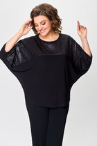 Свободный крой блузки и спущенная линия плеча  дарят ощущение легкости и непринужденности, делая образ одновременно женственным и современным. Широкие рукава средней длины гармонично дополняют образ и идеально подходят для полных рук, обеспечивая комфорт, свободу движений и уверенность. Аккуратная застежка на маленькую пуговицу добавляет утонченности, а круглый вырез красиво обрамляет шею, создавая аккуратную линию декольте.