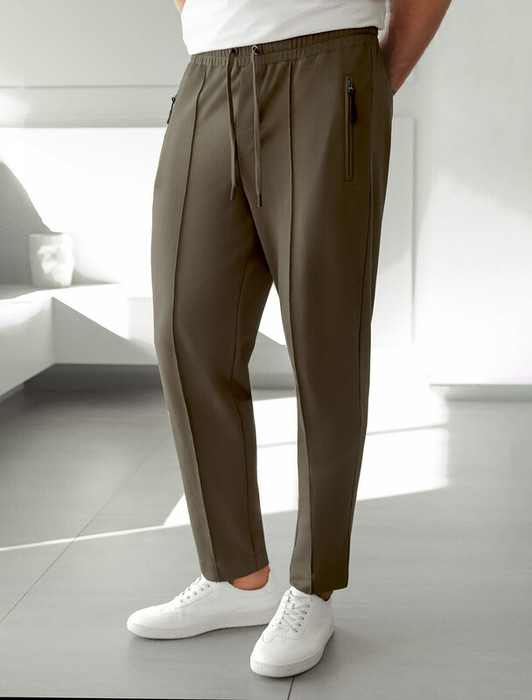 Свободные брюки практичного цвета хаки с эластичным поясом на резинке и шнуром изготовлены из премиального футера двухнитки. Натуральная ткань, в составе которой хлопок и эластан, отличается дышащими свойствами и мягкостью на ощупь, обеспечивает комфорт и удобство в повседневной носке. Трикотажные брюки сохраняют свой первоначальный вид после многочисленных стирок, что делает их практичными для активного использования. Повседневные брюки дополнены карманами по бокам  и одим задним карманом на молнии, что позволяет удобно хранить необходимые мелочи. Внизу расположены затяжки на стопорах, тем самым можно регулировать посадку под индивидуальные предпочтения каждого мужчины.