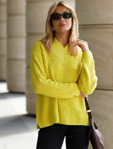 Джемпер выполнен из мягкой хлопковой пряжи с добавлением акрила. Трендовый воротник с высоким V-вырезом и крупная вязка сделали изделие универсальным решением при выборе, между свитером и джемпером в холодное время года. Изделие дополнено металлическим логотипом бренда.