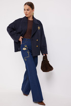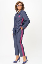 В синем цвете ткань немного толще, чем голубой и черный цвета. Свободные штанины вверху, заужаются к низу, делая силуэт стройнее, открывая нижнюю часть лодыжки.