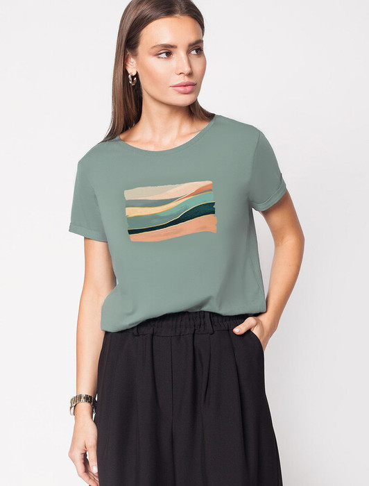 Совместные покупки Симферополь Женская одежда Футболки — Vilatte Футболка из эластичного хлопка с принтом стразы D49.097 св. оливковый_so