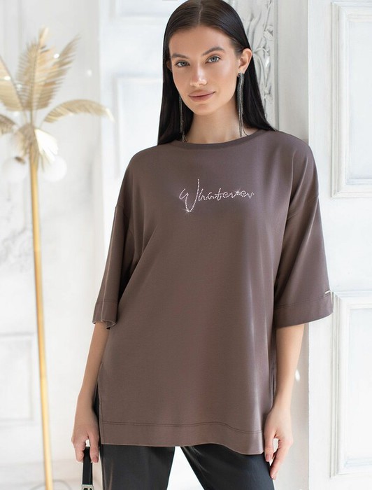 27.03 Vilatte Футболка оверсайз с принтом стразами из премиального хлопка с эла