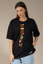 Оверсайз футболка черного цвета из премиального хлопка с добавлением эластана создана для комфорта и стиля каждый день. Натуральный материал приятный к телу, дышащая ткань хорошо держит форму и подходит для повседневной носки дома, в офисе или на прогулке. Классический свободный крой, удлиненный прямой силуэт и свободная посадка делают эту базовую футболку универсальным решением для любой фигуры и роста, включая плюс сайз размеры и беременных девушек, отлично скроет животик. Широкие рукава держат форму и подойдут на полные руки. Нарядная футболка украшена авторским принтом пайетками. Такой акцент делает модель уместной как для особых случаев, так и для ежедневных образов.