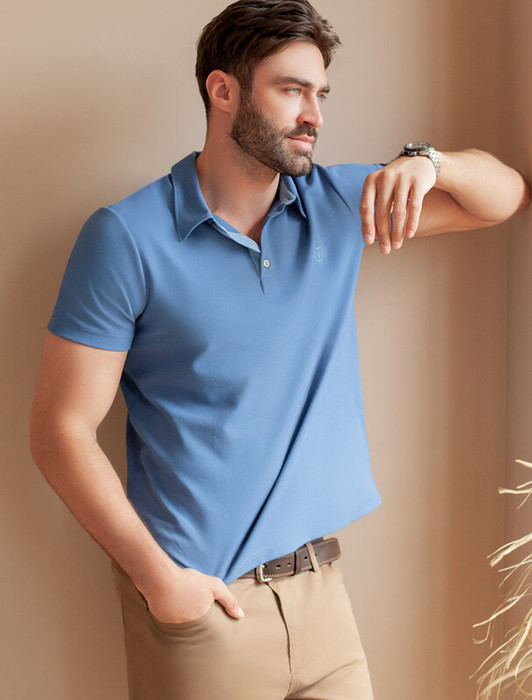 Футболка-поло выполнена из фактурного трикотажа. Однотонная модель с контрастной планкой и металлическими пуговицами с логотипом бренда. Эластичный хлопковый материал хорошо пропускает воздух и комфортно облегает фигуру. В таком изделии не будет жарко даже в самое теплое время года.