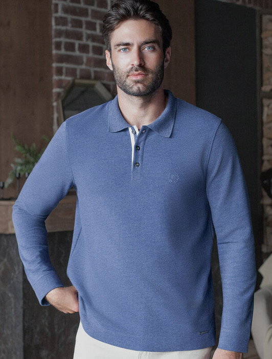 Поло хорошо садится по фигуре благодаря добавлению эластичных волокон — такой вариант подходит для мужчин любого роста и размеров, не стесняет движений и создает ощущение свободы и легкости.  Лонгслив с пуговицами дополнен  ненавязчивой вышивкой на