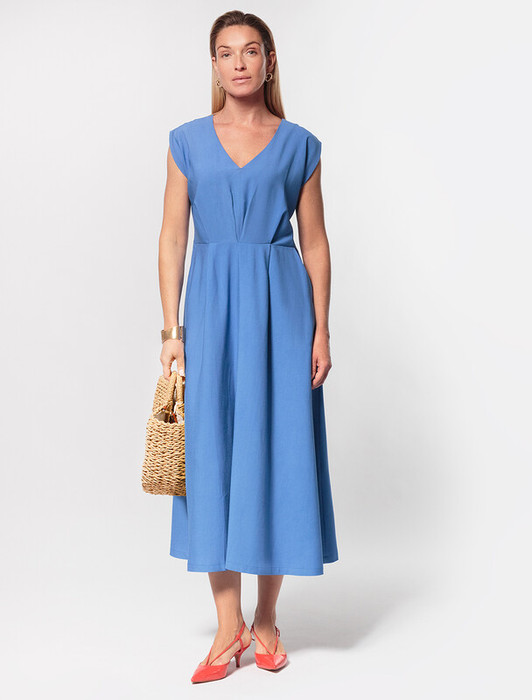 Платье выполнено из плотного лиоцелла. Модель дополнена карманами. Сзади застежка на потайную молнию. Ткань хорошо держит форму и почти не мнется. Слегка завышенная талия и пышная юбка подчеркивают романтический образ. Подходит для любой фигуры.