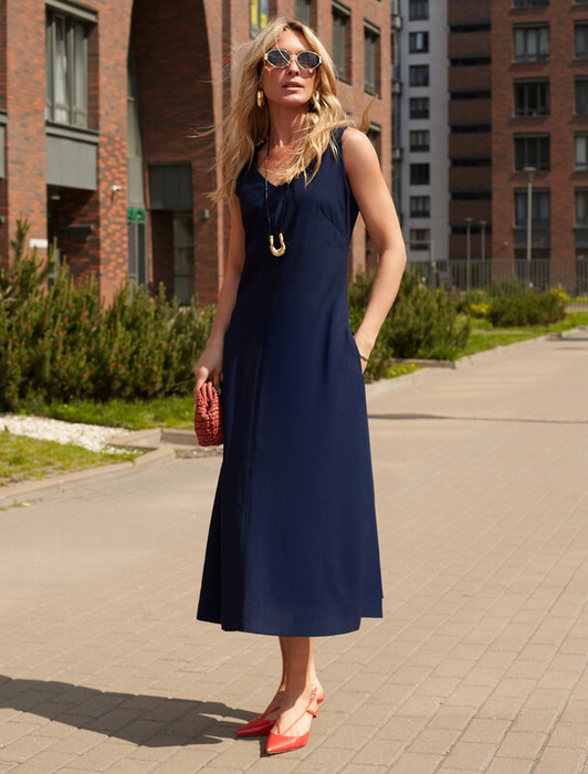 Платье с V-вырезом выполнено из плотного лиоцелла. Лаконичная модель с открытыми плечами и слегка расклешённым низом. Ткань изделия отлично держит форму, плавно драпируется и не просвечивает. В теплое время года приятно охлаждает кожу. Добавление синтетических волокон в составе изделия, предотвращает сминаемостьи поддерживает формоустойчивость.