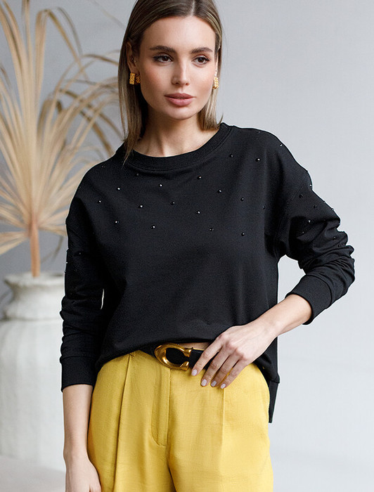 Совместные покупки Симферополь Женская одежда Джемперы, свитеры, водолазки — Vilatte Свитшот из эластичного футера с принтом стразами D49.072 черный_стразы