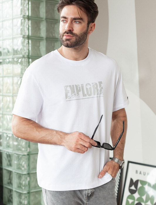 Совместные покупки Симферополь Мужская одежда Футболки — Vilatte Свободная футболка с авторским принтом U49.048 белый_explore геометрия