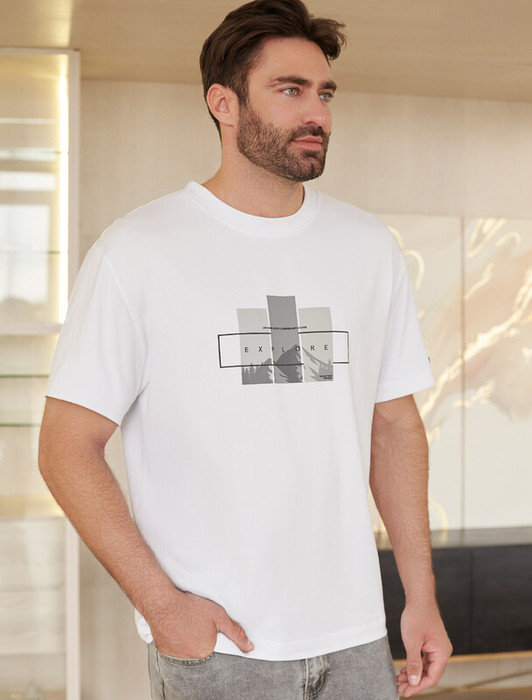 Совместные покупки Симферополь Мужская одежда Футболки — Vilatte Свободная футболка с авторским принтом U49.048 белый_explore прямоуголь