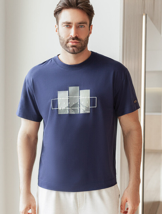 Совместные покупки Симферополь Мужская одежда Футболки — Vilatte Свободная футболка с авторским принтом U49.048 т.синий_explore прямоуго