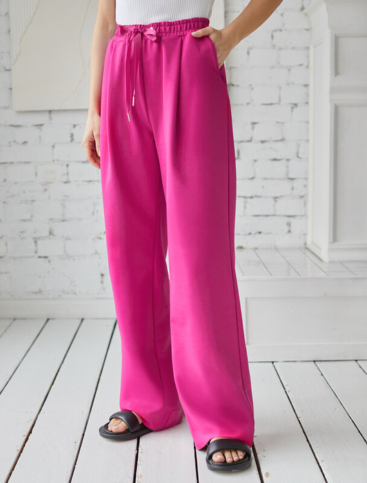 Брюки свободного кроя выполнены из эластичного футера-двухнитки. Модель дополнена защипами и боковыми карманами как у классических брюк и одним задним карманом. Эластичный пояс на резинке с шнурком из репсовой ленты и металлической фурнитурой. Брюки сочетаются в костюме с футболкой D49.031, D49.085, бомбером D49.038 и паркой D49.075