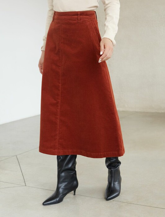 Юбка-миди трапециевидного силуэта  выполнена из мягкого хлопкового микро-вельвета с добавлением эластана. Изделие комфортно садится по фигуре и не сковывает движения. Модель дополнена высококачественной фурнитурой с фирменным логотипом бренда. Хорошо комбинируется с вязаным трикотажем, блузками и денимом.Также прекрасно станет альтернативой деловым низам  в нестрогом офисном дресс-коде.