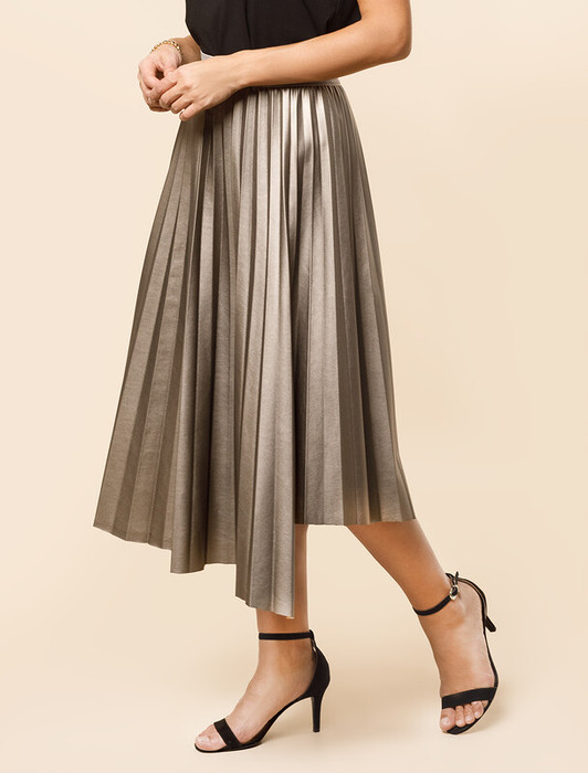 Асимметричная плиссированная юбка выполнена из мягкой эко-кожи. Посадка на талии акцентирована поясом из эластичной вельветовой ленты. Полуматовое покрытие смотрится утонченно и легко поможет создать вечерний образ, а также в повседневных образах станет отличным компаньоном к свитерам и высоким сапогам.  На уровне ассиметричной линии спереди находится разрез, открывающий ноги. Атласное внутреннее покрытие обеспечивает идеальный комфорт при носке с колготками.