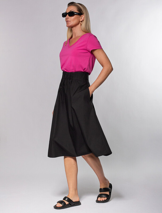 Юбка выполнена из плотного поплина. Удобный пояс на широкой резинке подчеркивает талию при этом не сковывая движений. Модель дополнена удобными карманами по бокам. Материал изделия прочный и износостойкий, но при этом мягкий и удобный, отлично держит форму и подходит для повседневной носки, гарантируя абсолютный комфорт даже в жаркое время года. Без подкладки