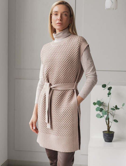 Удлиненный жилет выполнен из мягкой пряжи с кашемиром. Модель фактурной вязки дополнена высокими боковыми разрезами и поясом в тон изделия. Хорошо сочетается водолазками, лонгсливами и блузками. Мягкая пряжа очень приятная к телу, поддержит комфорт на протяжении всего дня, при этом не перегревая. Сочетается в костюме с брюками D38.013, D38.012 и юбкой D36.016