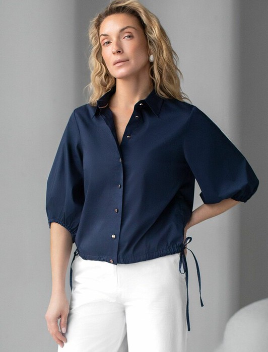 Укороченная блузка темно-синего цвета из эластичного хлопка идеальна на весну и лето. Стильная модель с пышными рукавами буфами создает эффектный и женственный образ, который подойдет как для деловой работы, так и для повседневной носки.  Практичная кулиска по низу держит форму изделия, подчеркивая талию и создавая аккуратный силуэт, а так же позволяет регулировать посадку, добавляя функциональности и удобства. Благодаря сочетанию качества материала и продуманного дизайна, рубашка хорошо сидит и на больших размерах, обеспечивая комфорт и свободу движений. Короткие рукава фонарики придают образу модный акцент, делая его более выразительным и динамичным. Натуральная ткань гарантирует комфорт и воздухопроницаемость, что особенно важно в теплое время года.