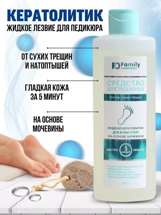 ЖИДКИЙ КЕРАТОЛИТИК ДЛЯ КОЖИ СТОП НА ОСНОВЕ МОЧИВИНЫ СЕРИИ FAMILY COSMETICS Мягкий кератолитик на основе мочевины эффективно действует на сухой коже, не травмируя ее и возвращая гладкость за короткий срок. Быстро растворяет белки и липиды, из которых состоит эпидермис, поверхность кожи становится рыхлой и омертвевшие частицы без усилий удаляются пилкой для ухода за кожей стоп.