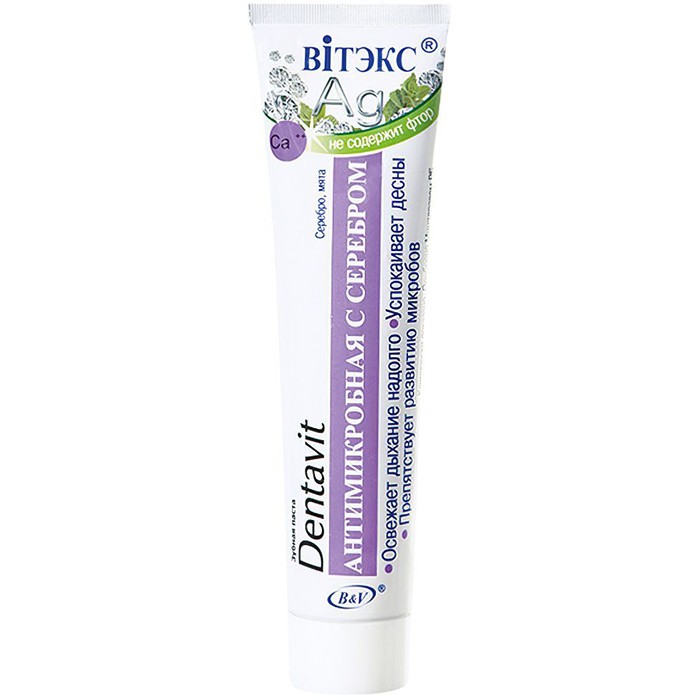 Для тех, кому врач рекомендовал на некоторое время воздержаться от применения фторсодержащих паст, зубную пасту «Dentavit» антимикробная с серебром без фтора. Уже в V веке до н.э. люди знали, что серебро — прекрасный природный антисептик. Содержащееся в зубной пасте коллоидное серебро препятствует развитию микроорганизмов, вызывающих кариес и заболевания пародонта. Натуральная чистящая основа мягко и эффективно удаляет зубной налет.