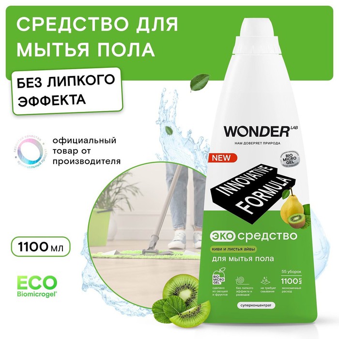 Безопасное и инновационное экосредство для мытья пола WONDER LAB киви и листья айвы подходит для мытья полов с любым покрытием. Средство эффективно удаляет все возможные загрязнения с линолеума, ламината, керамической плитки, мрамора, паркета. Экосредство экономично расходуется благодаря концентрированной формуле.