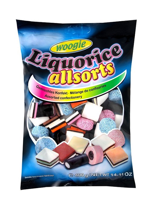 Woogie Ассорти лакрицы 400г Ингредиенты: Сахар, сироп глюкозы, мука пшеничная, патока из тростникового сахара, кокос, желатин, крахмал пшеничный, экстракт солодки, какао-порошок, натуральные ароматизаторы, эмульгатор: Е471; краситель пищевой (Концентрат из спирулины, сафлора, моркови, гибискуса), красители: Е160с, Е162; Кокосовое масло, глазирующий агент: E901. Аллергены: Может содержать следы сульфитов и сои. Пищевая ценность на 100 г Энергетическая ценность 1583 кДж Энергетическая ценность 374 ккал. Жир 4,20 г из них насыщенные жирные кислоты 3,60 г Углеводы 81 г из них сахар 63 г Белок 2,50 г Клетчатка 1,20 г Соль (=Натрий х 2,5) 0,05 г
