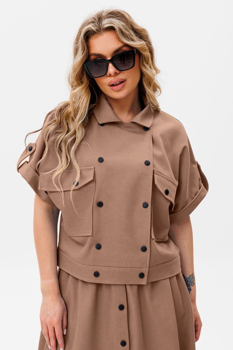 Жакет женский двубортный прямого силуэта с цельнокроеным рукавом. Рукав короткий с отложной манжетой на пате. По переду накладные карманы с клапаном. Спинка со швом.