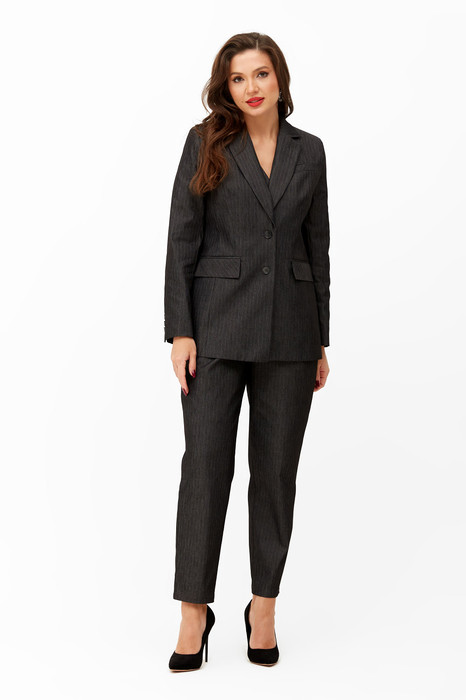 Жакет женский полуприлегающего силуэта, выполнен из плотного джинса в полоску. Жакет с центральной застежкой на петли и пуговицы, с пиджачным воротником, с втачными рукавами. Перед с нагрудными вытачками, отрезными бочками, прорезными карманами «в рамку» с клапаном и прорезным с листочкой.   Спинка с отрезными бочками и средним швом. Рукава двухшовные со шлицей.