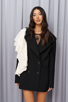 Жакет с застёжкой спереди на петли и пуговицы, с пиджачным воротником и втачными двухшовными рукавами со шлицами и акцентными пуговицами. По переду выполнены боковые карманы с клапанами и нагрудный накладной карман с съёмным дизайнерским украшением, спинка со швами.