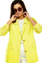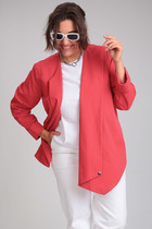 Прямой силуэт с чёткими линиями подчёркивает женственность, не утяжеляя образ. Втачной двухшовный рукав со шлицей обеспечивает свободу движений, а отложной воротник с лацканами добавляет ноту элегантности. Завершает композицию шлица в среднем шве спинки — деталь, которая придаёт жакету динамику и лёгкость.
