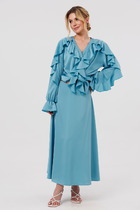 Его прямой силуэт со спущенным плечом и изящными разрезами по бокам струится легко и свободно, подчеркивая достоинства, не сковывая движений. Глубокий V-образный вырез горловины добавляет образу женственности и строгой элегантности, а классическая застежка на красивые пуговицы завершает безупречный вид.