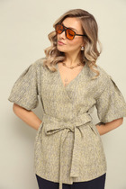 Жакет-бомбер женский прямого силуэта, с притачной манжетой понизу, без подкладки. Горловина округлая с втачной стойкой. По переду центральная застежка на кнопки и наклонные прорезные карманы с листочкой. Рукава длинные втачные, со спущенной линией плеча, понизу - на манжете. Воротник-стойка, манжеты по низу рукава и по низу жакета из трикотажного довяза.