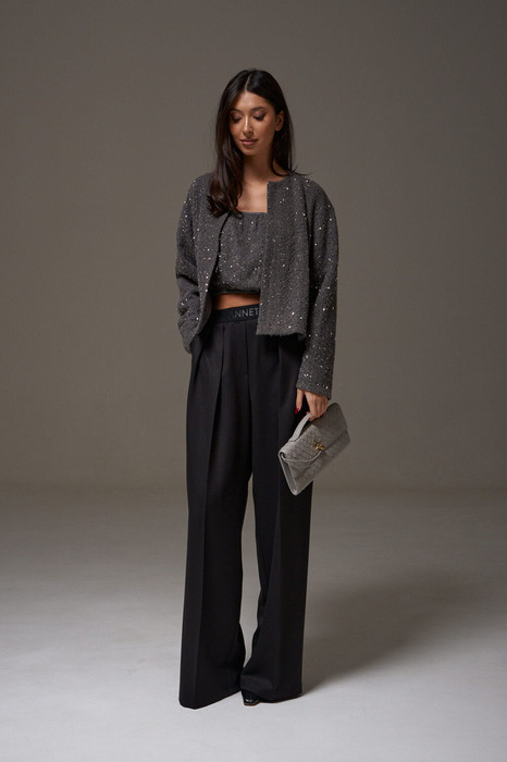 Джемпер свободного прямого кроя, выполнен из мягкой пушистой ткани серого цвета с пайетками. Характеристики: прямой крой, горловина овальная, рукав спущен, брендированная подкладка. Длина по спинке 51см, длина рукава от края горловины 71см.